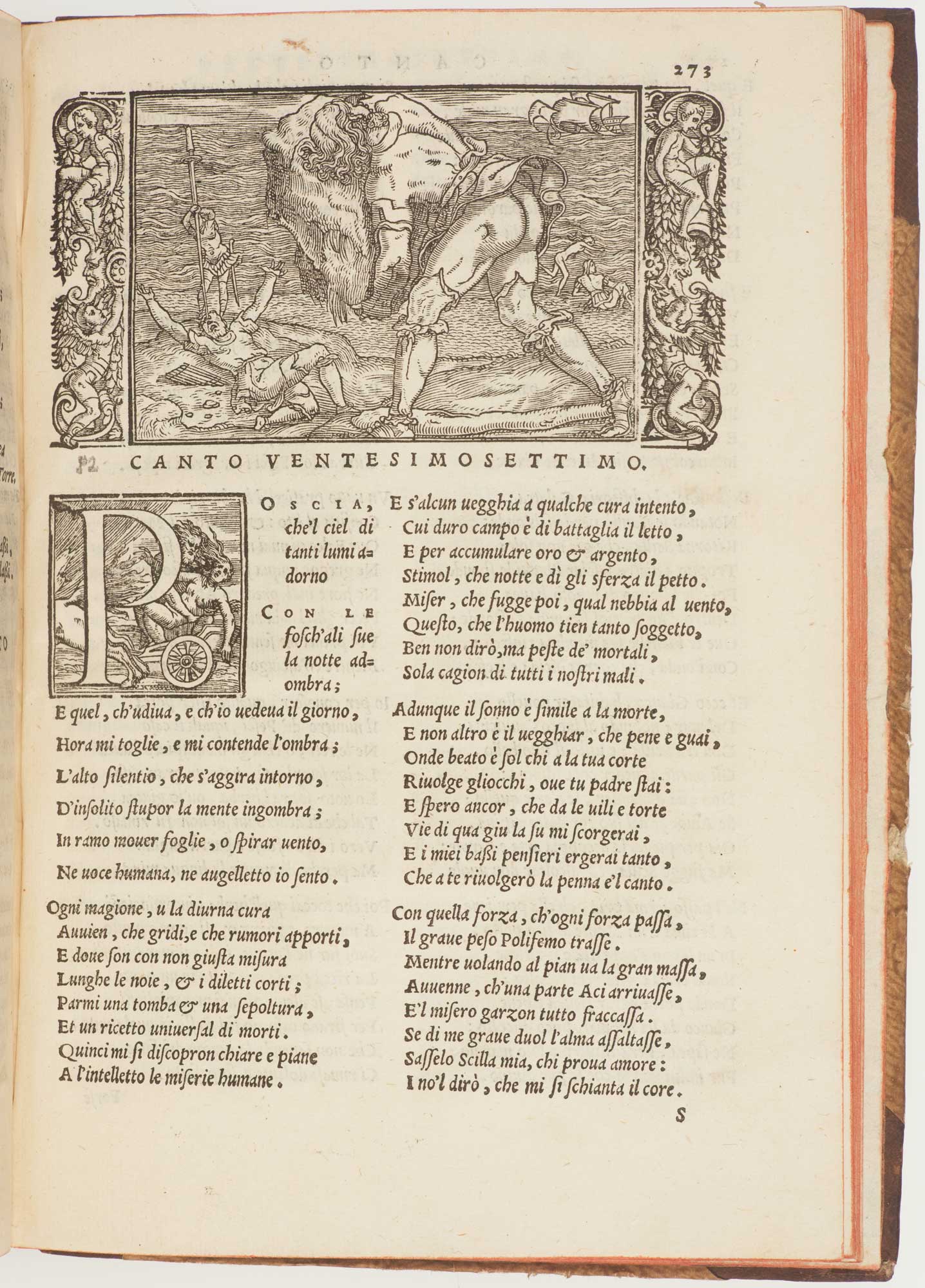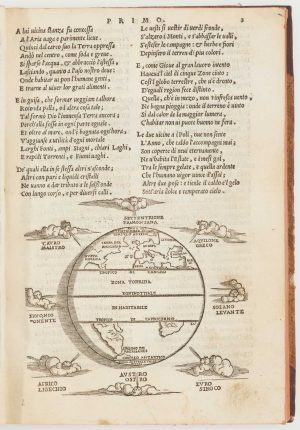 The fourth edition of Lodovico Dolce's translation of Ovid's 'Metamorphoses', first published 1553. It is illustrated with numerous woodcuts, including a world map which is an amalgam of Macrobius and Gastaldi: the shape is that of Macrobius, with the zones around the equator and windheads; however on North America are 'Terra del Bacalaosa' and 'Nueva Hispania' of Gastaldi. The Straits of Magellan also appear.