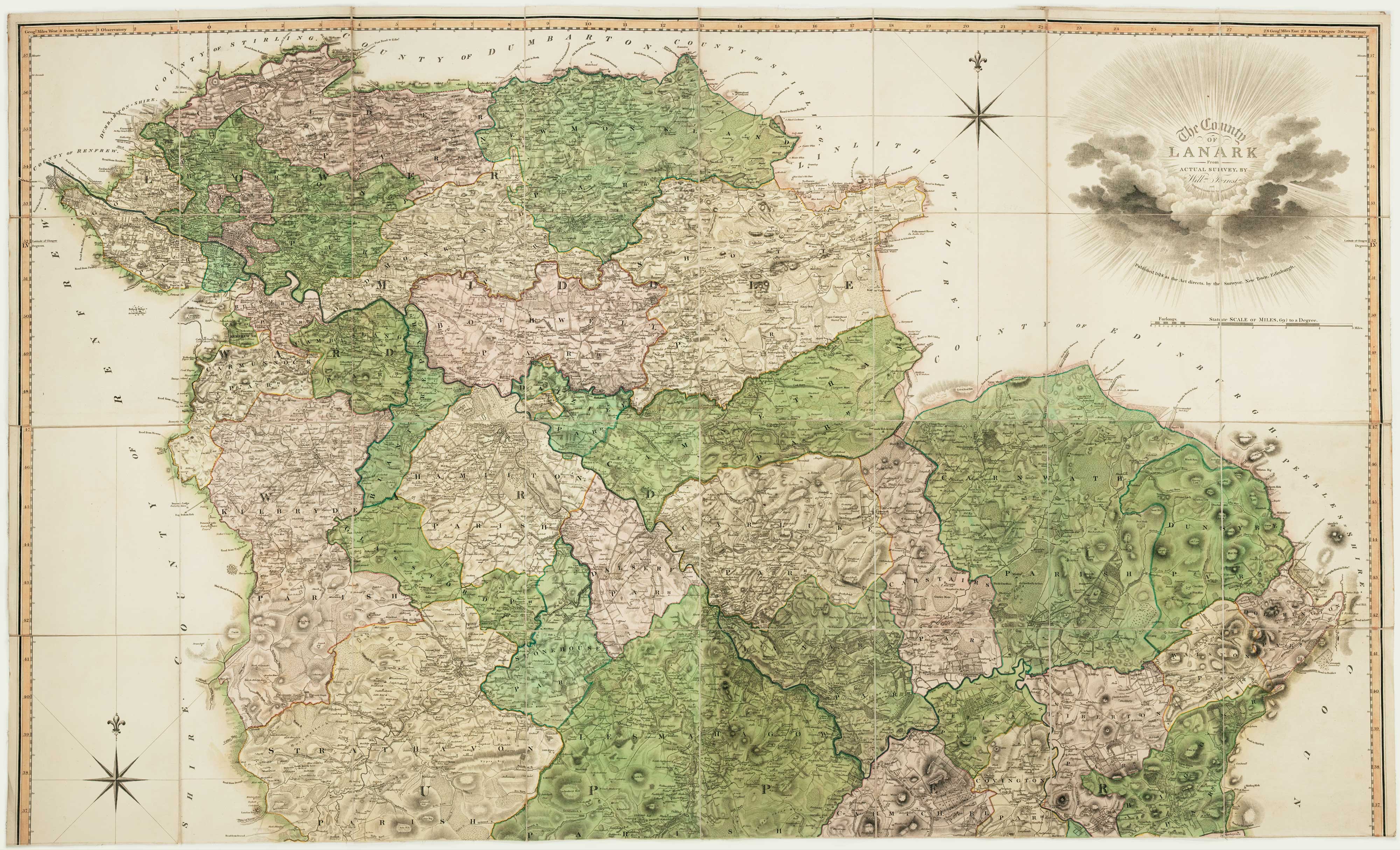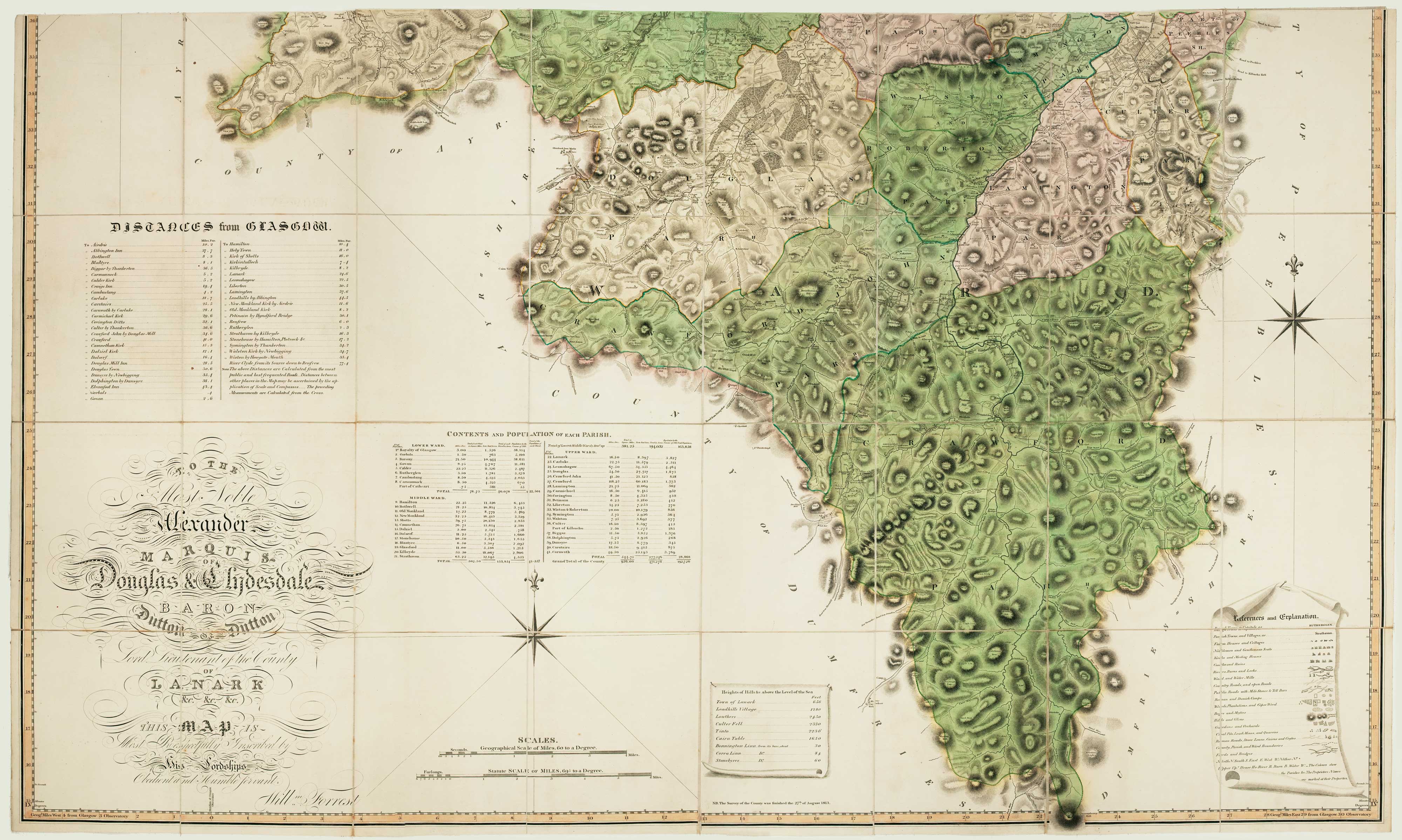 A monumental map of Lanarkshire (now in eastern Strathclyde), on a scale of 1¾ inches to a mile, with a decorative title cartouche and a dedication to John Hope (1765-1823), Earl of Hopetoun, a Lieutenant General who took command of the British Army in Iberia after the death of Sir John More at the Battle of Corunna in 1809. A key and table of mountain heights are on tromp-l'oeil scrolls.