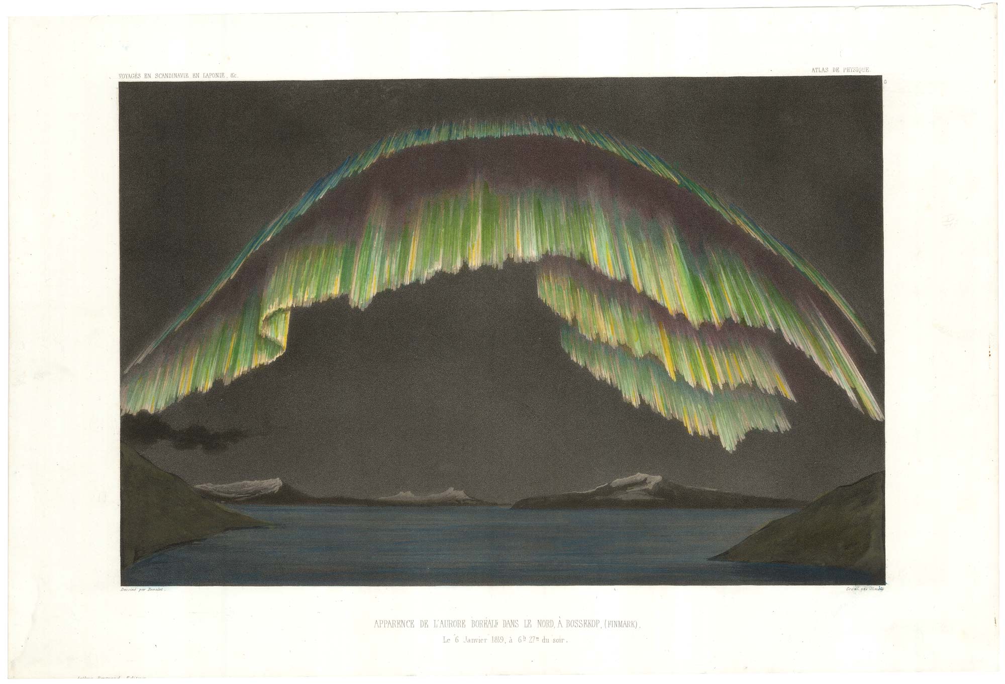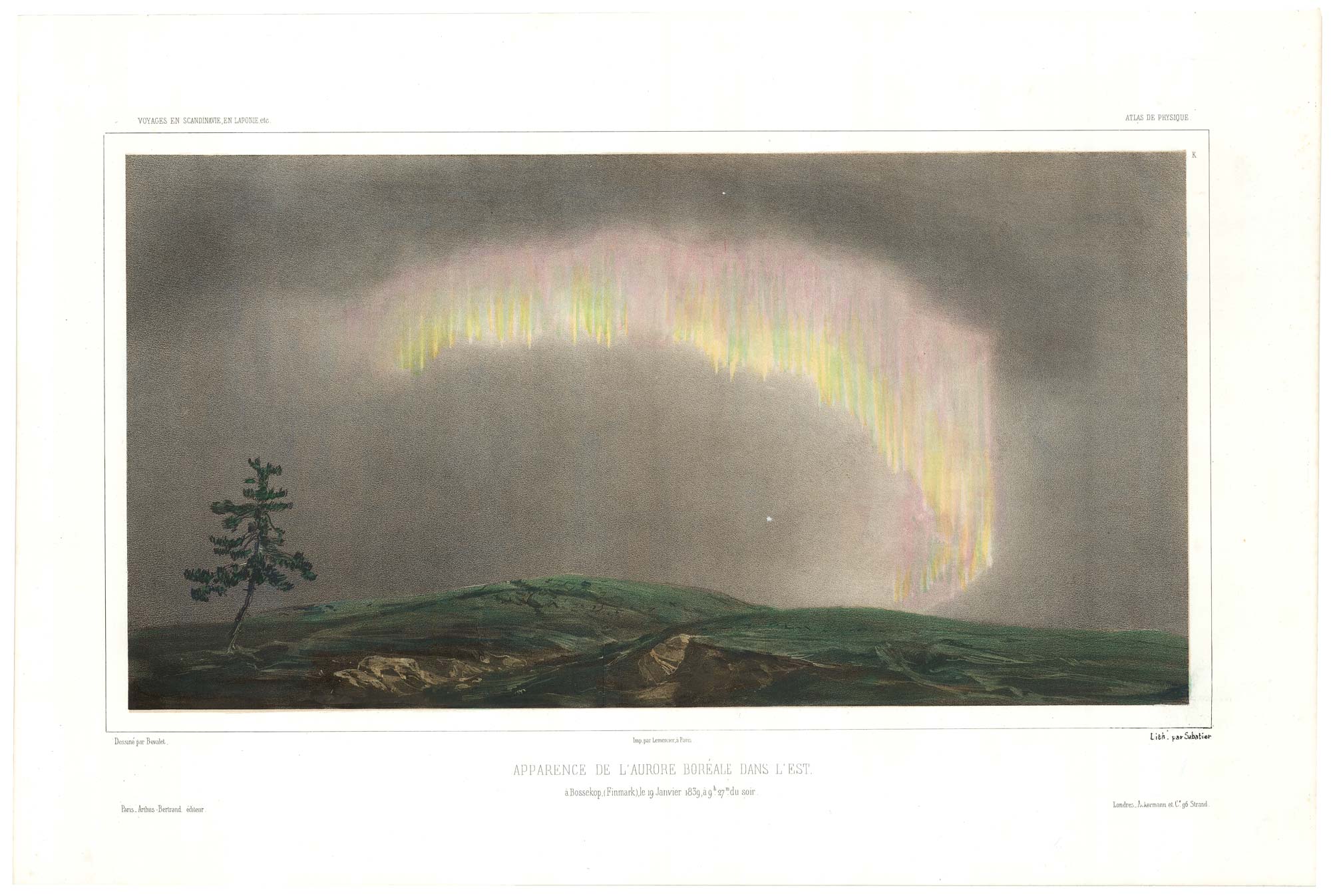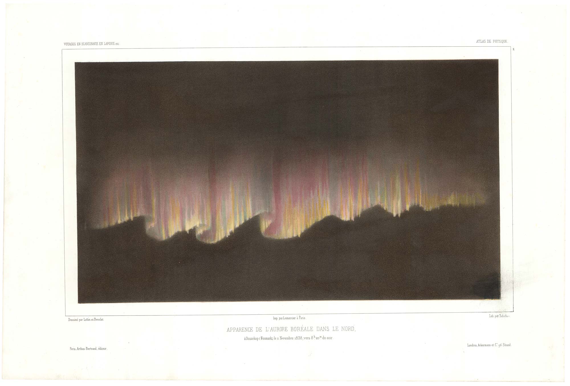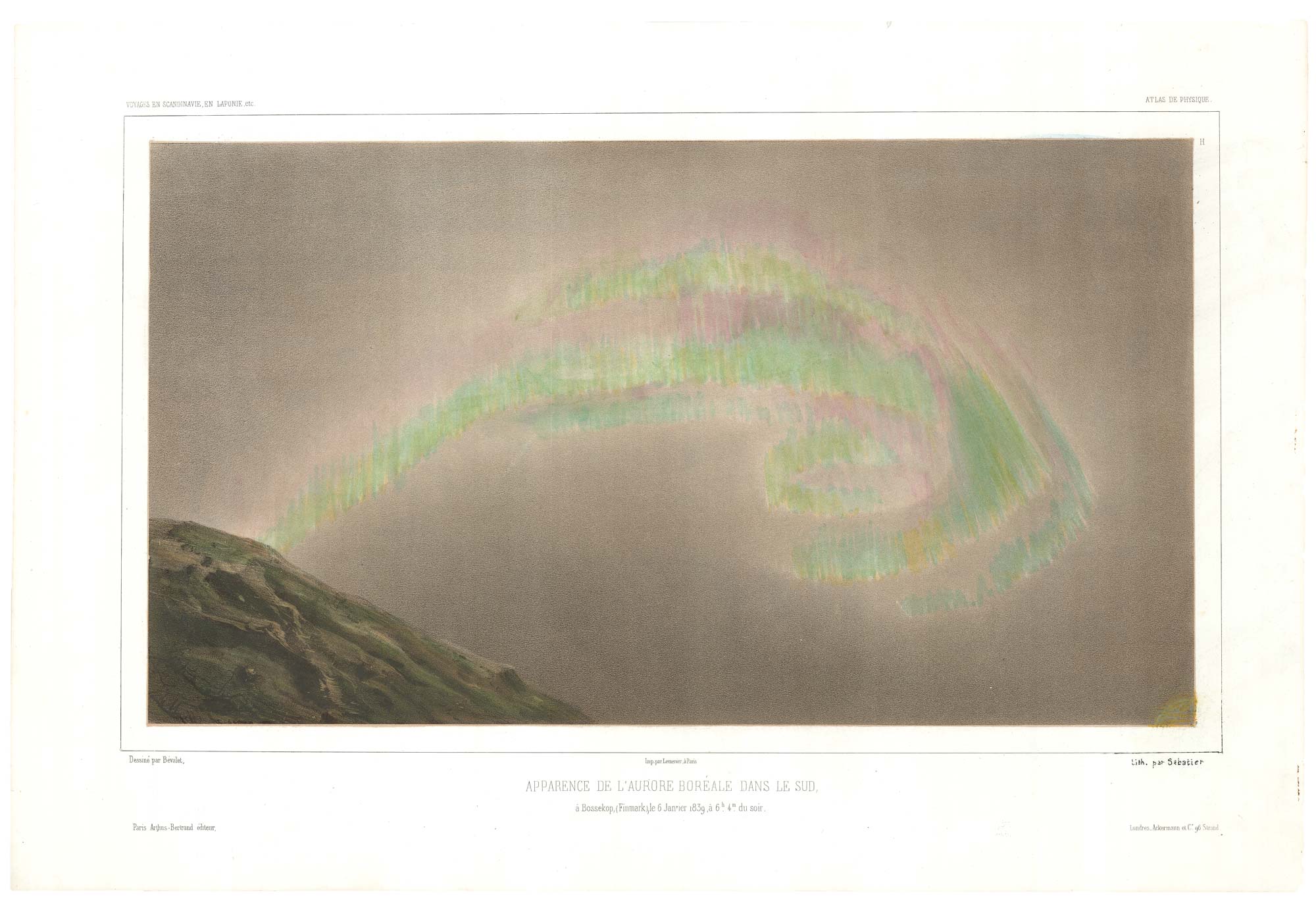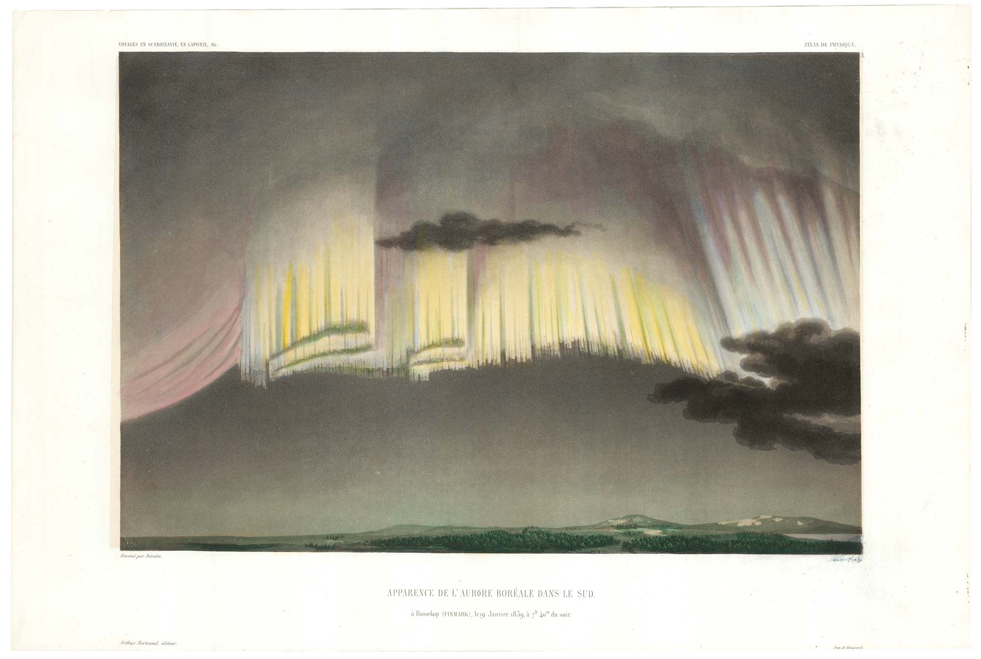 A selection of six beautiful views of the Northern Lights, as seen from Bosskop and Kafjord in Finnmark county, in northern Norway. Illustrating the range of dynamic patterns, they were drawn by Louis Victor Bévalet and V. Lottin for Gaimard's 'Voyages de la Commission scientifique du Nord, en Scandinavie, en Laponie, au Spitzberg et aux Feröe: pendant les années 1838, 1839 et 1840 sur la corvette la Recherche'.