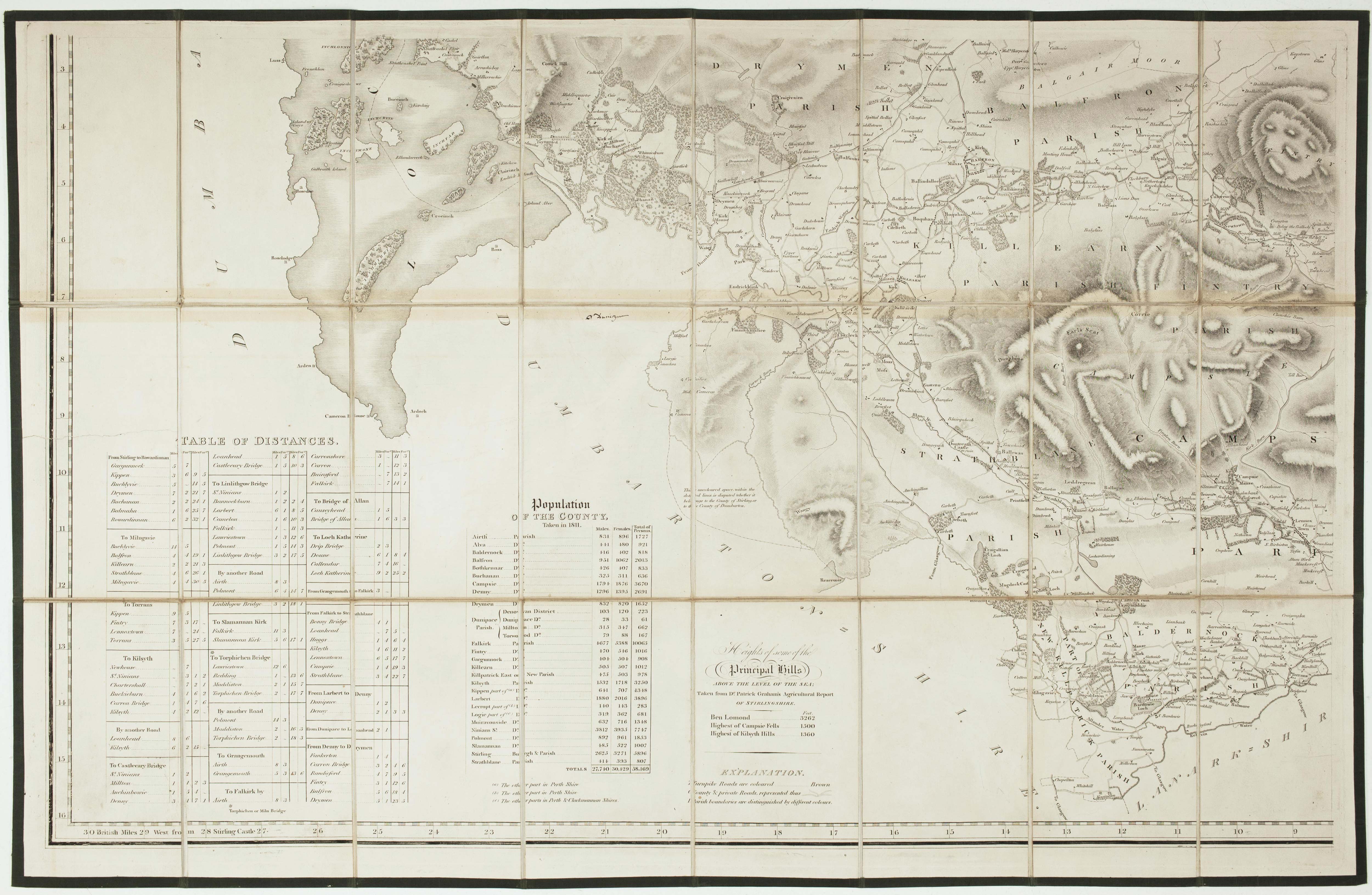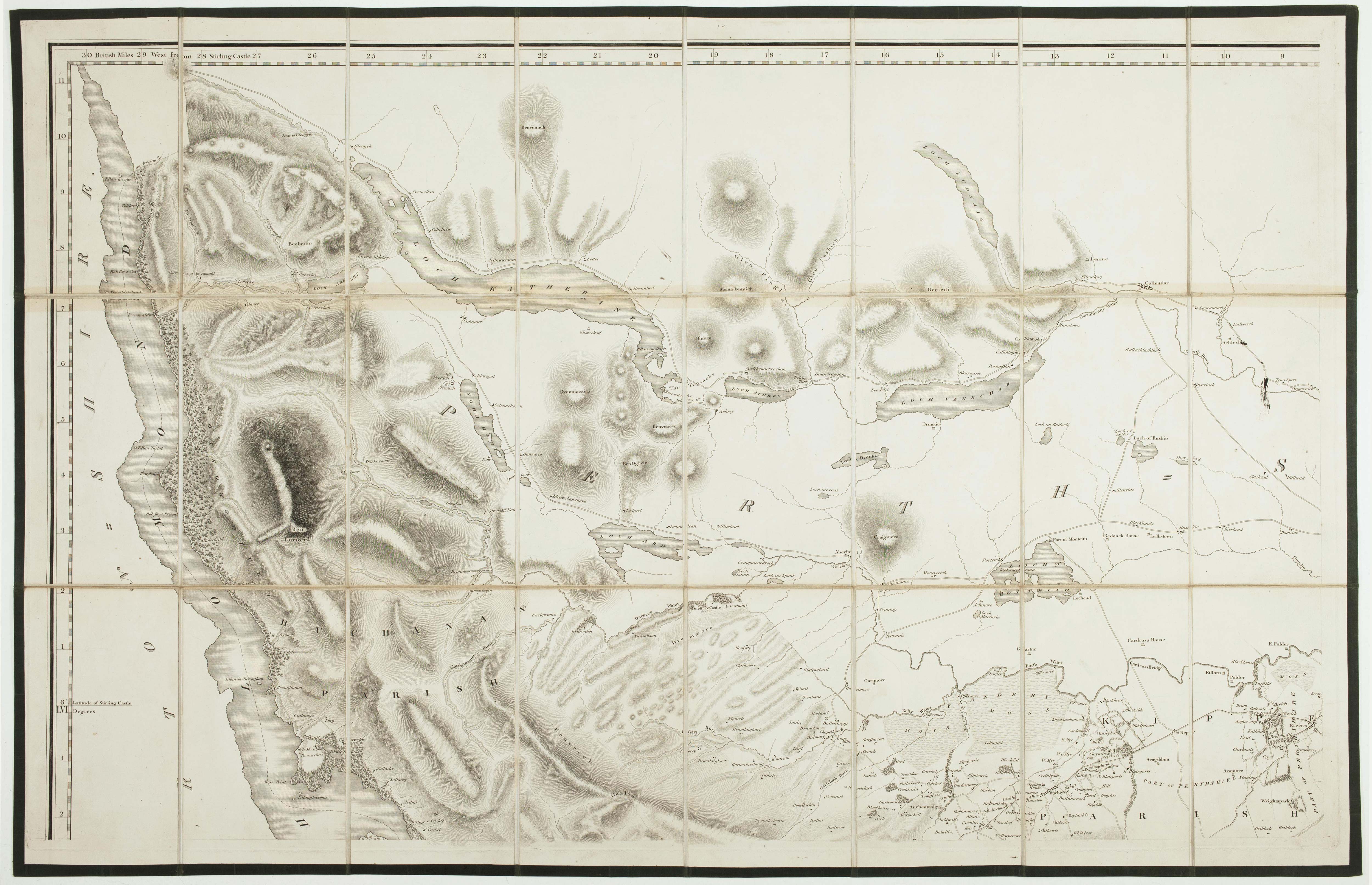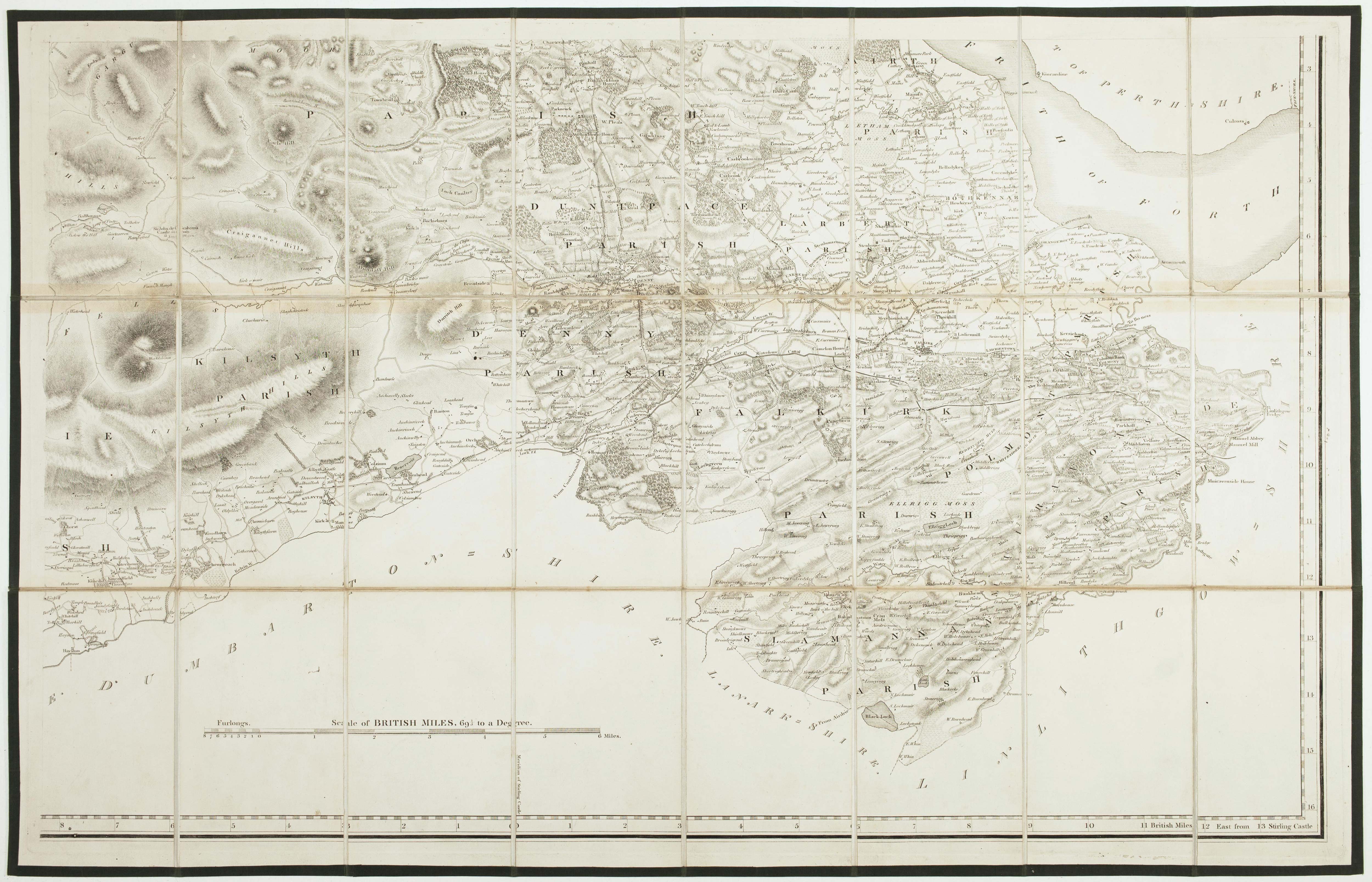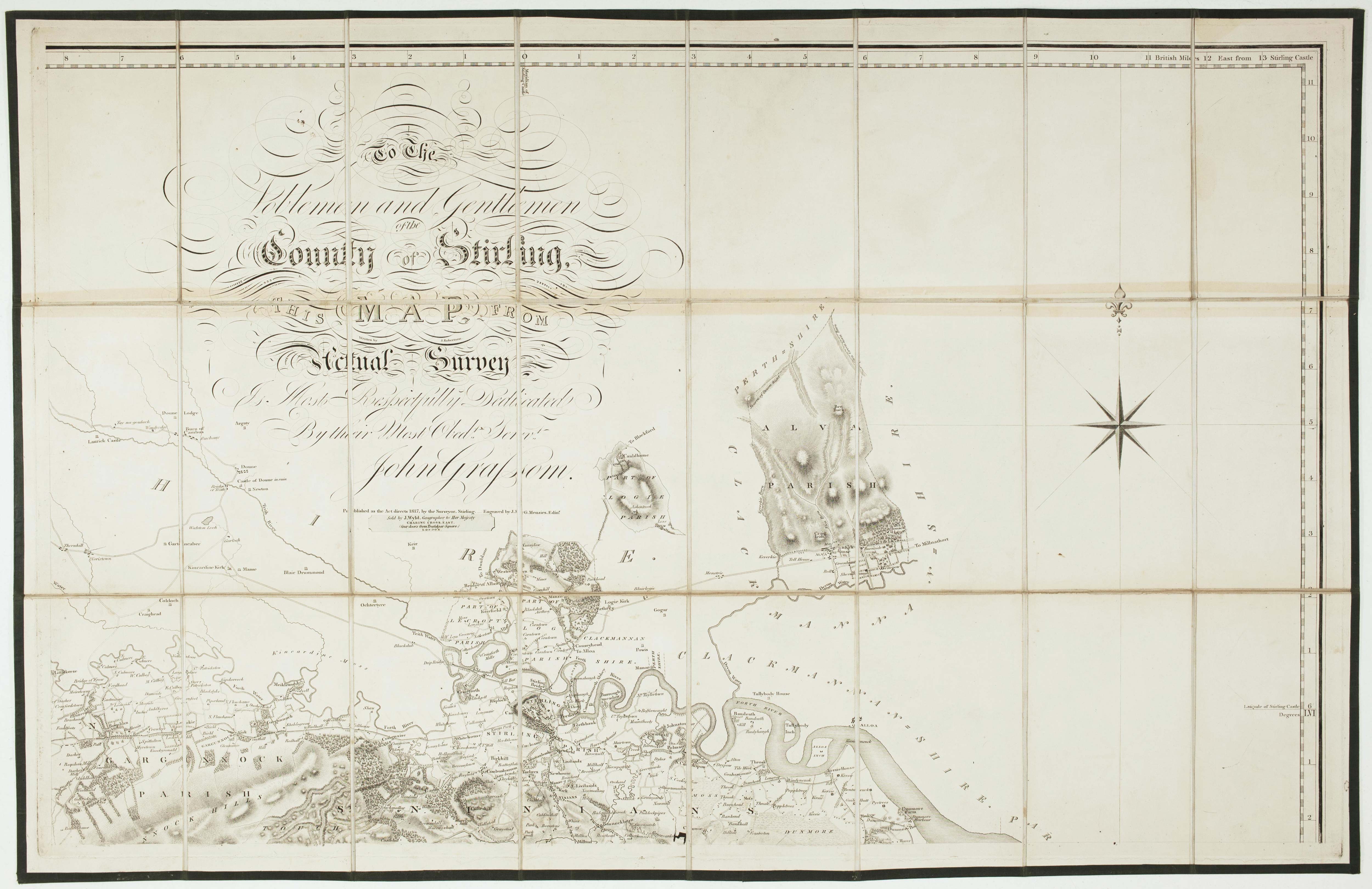 A scarce large-scale map of Stirlingshire, on a scale of 1½ inches to a mile, engraved by J. & G. Menzies. Grassom, a local surveyor, also surveyed the town of Stirling. His plan appeared on John Thomson's map of the county, the accuracy of which Grassom also 'attested'.
