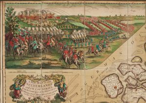 A folding map of the Austrian Netherlands, published during the Flanders Campaign of the French Revolutionary War. The large vignette above the title shows the Siege of Valenciennes in 1793, in which the British and Austrians under Prince Frederick, Duke of York and Albany, took the city from the Republicans. Frederick, shown here on horseback, waving his hat, was welcomed by the French population, who tore down the Republican Tricolour and proclaimed him King of France. Unfortunately this was one of the few successes of the campaign: the following year the Coalition was forced to retreat, reaching Bremen in Hanover in the Spring of 1795, leaving the Dutch Republic in the hands of France.