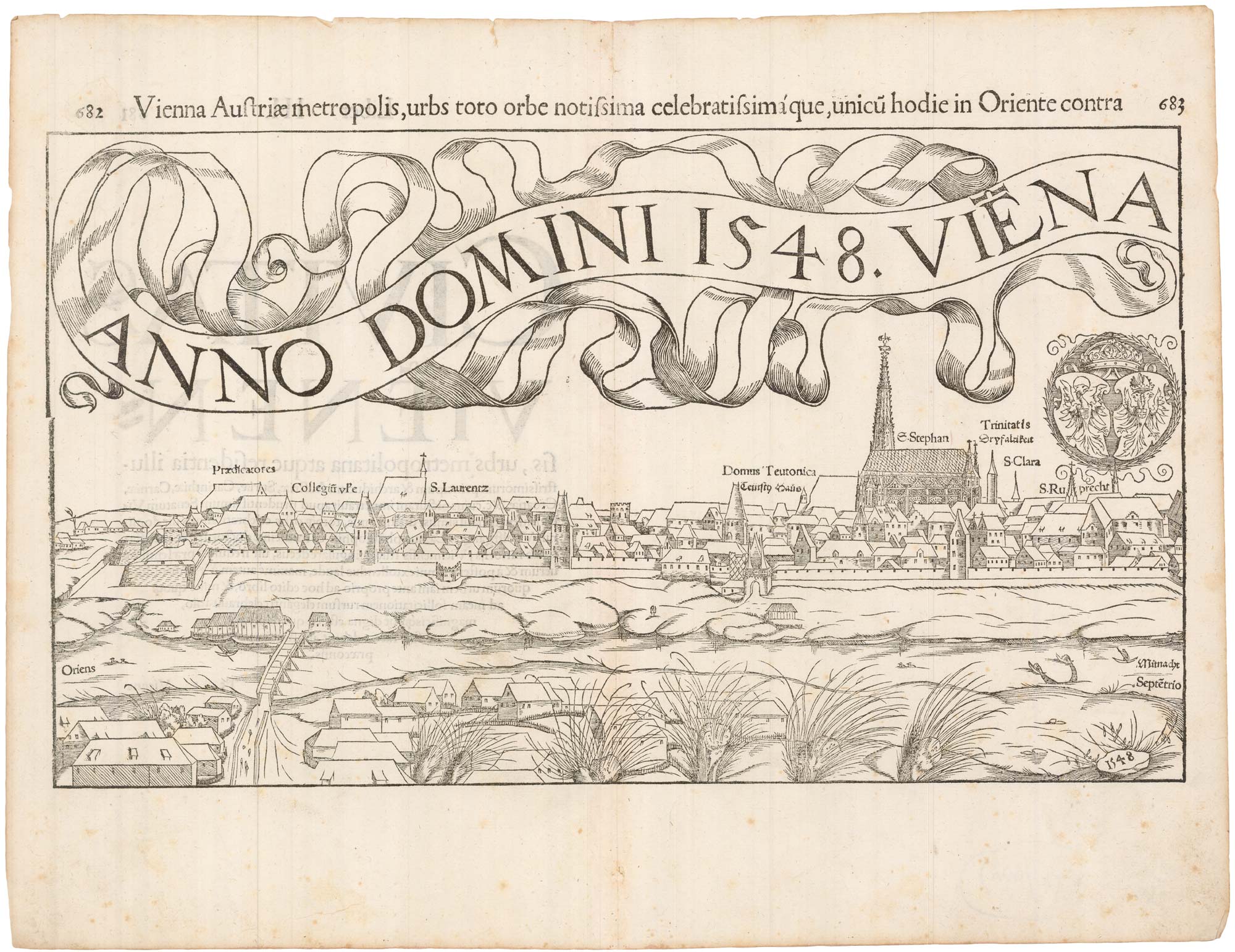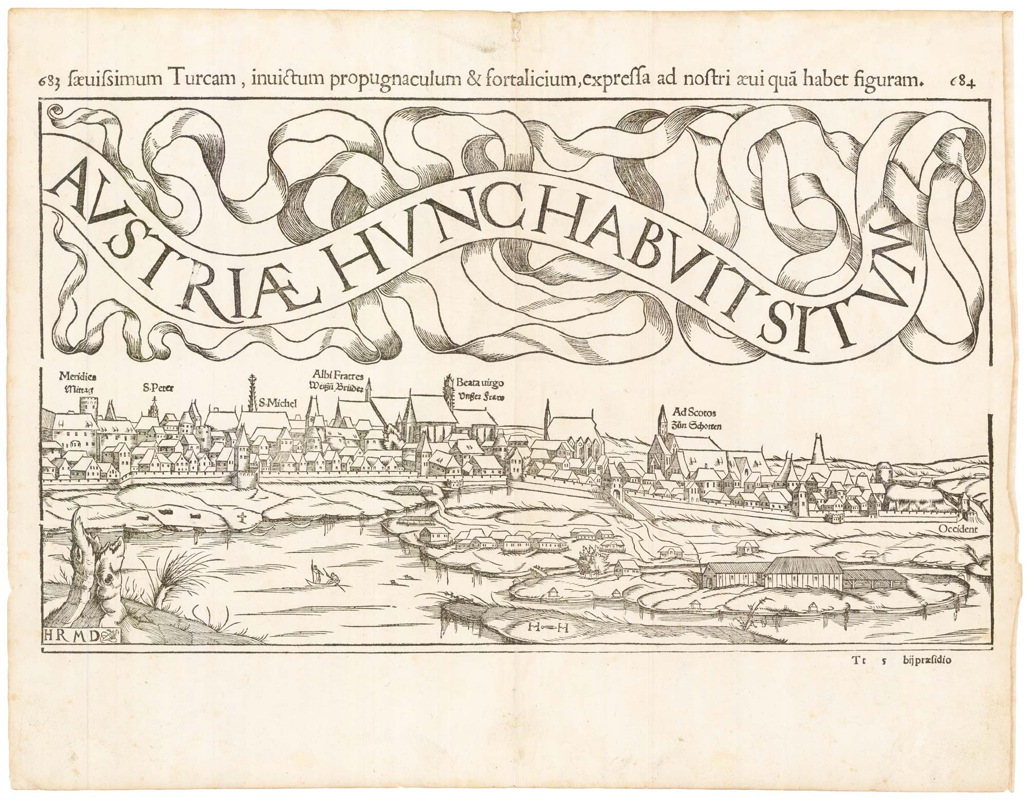 An early prospect of Vienna after Wolgang Lazio, signed on the right block 'HRMD' (Hans Rudolf Manuel Deutsch) & 'HH' (Heinrich Holzmüller), the woodcutters. The title is on a ribbon which swirls across both sheets.
