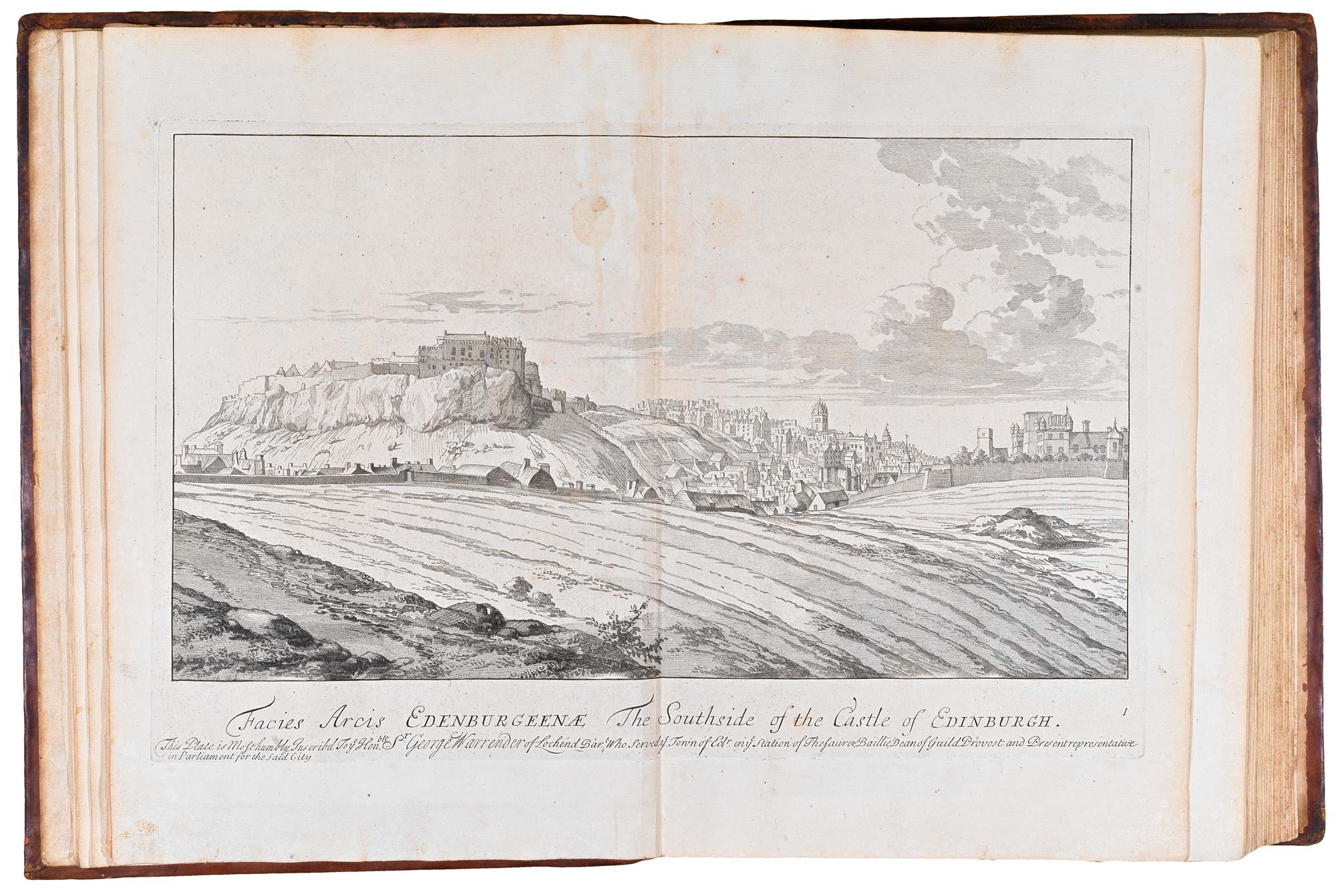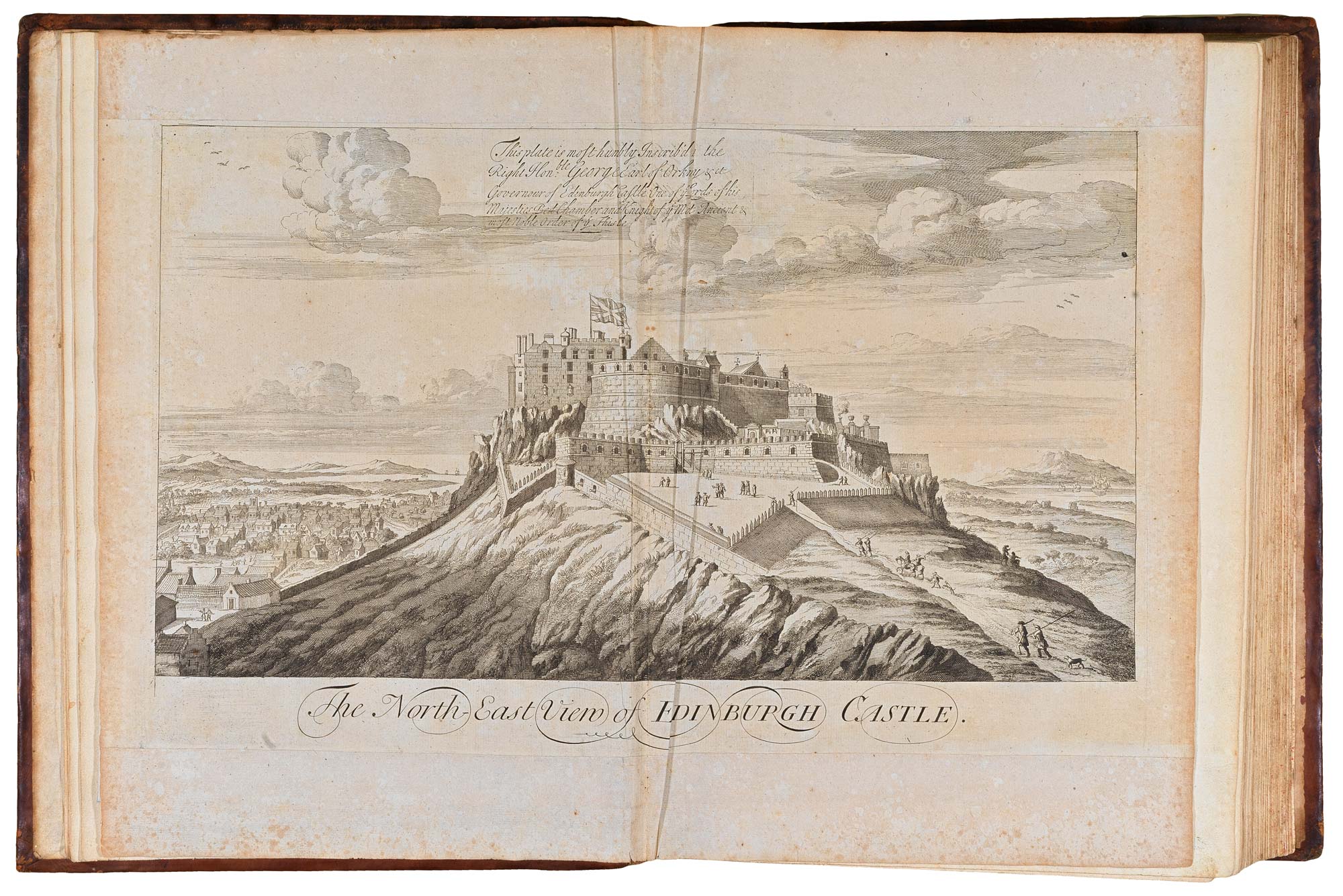 Despite being drawn c.1690, the two-sheet prospect of Edinburgh did not appear in the 'Theatrum Scotiae' until after Slezer's death, when further volumes became unlikely. This version was only issued in 1718, being replaced the following year with a larger version dedicated to Queen Anne.