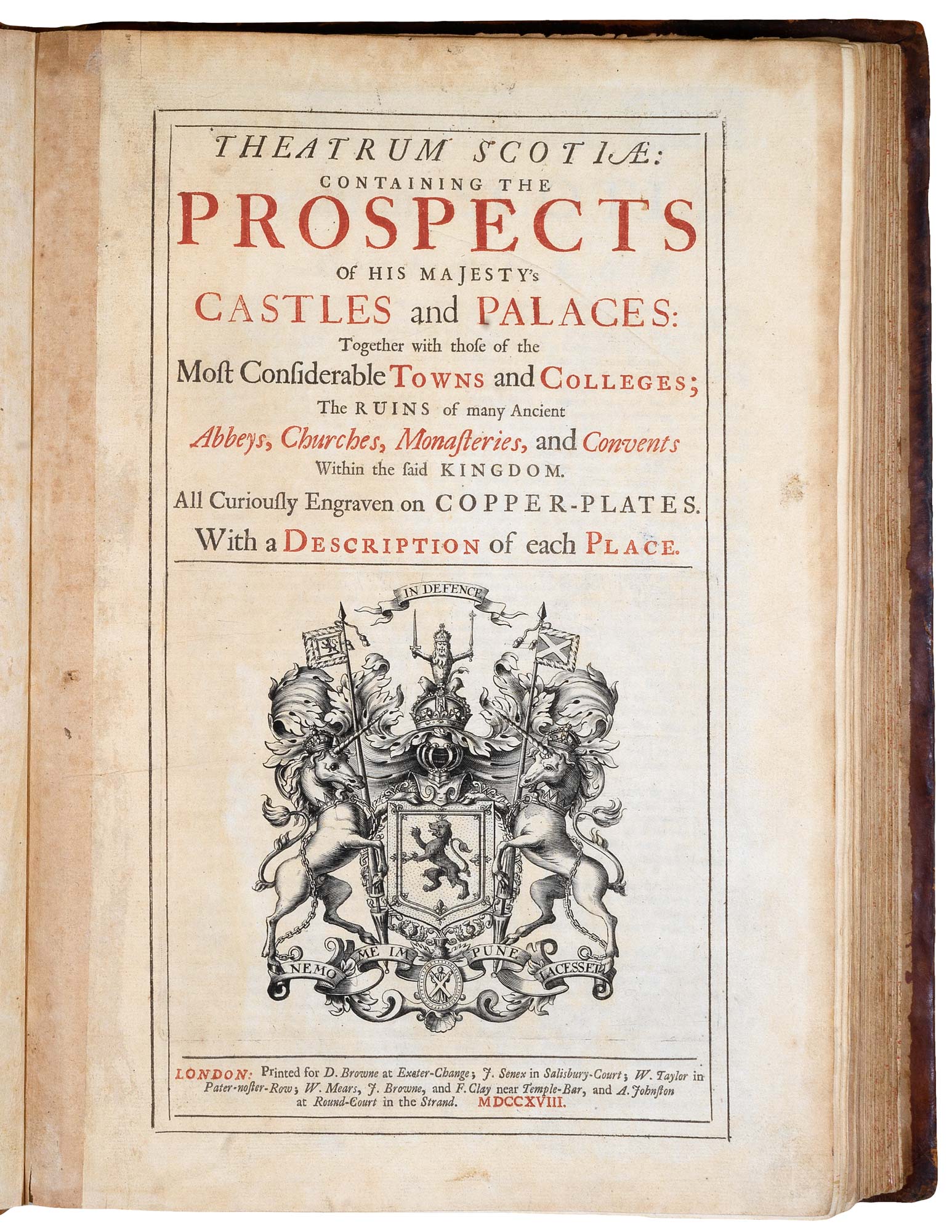 Theatrum Scotiae: Containing the Prospects of His Majesty's Castles and Palaces: Together with those of the Most Considerable Towns and Colleges; The Ruins of many Ancient Abbeys, Churches, Monasteries, and Convents Within the said Kingdom. All Curiously Engraven on Copper-Plates. With a Description of each Place.