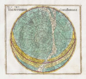 The northern & southern celestial spheres, engraved by Johann Christoph Berndt for the celestial atlas 'Mercurii Philosphici Firmamentum Firmianum', named for Thomas's patron, Leopold Anton von Firmian, Archbishop of Salzburg.
