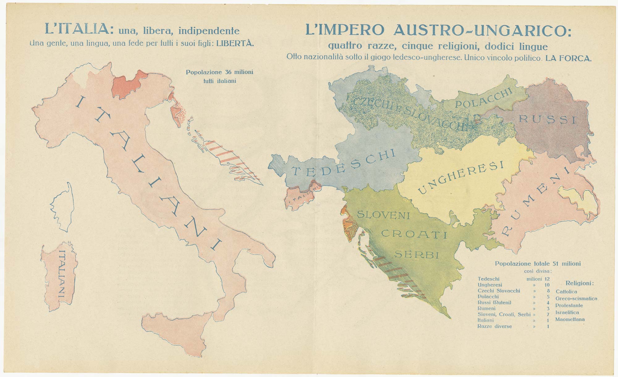On the reverse are maps of Italy, titled (in Italian) 'Italy: one, free, independent... Free'; and the Austro-Hungarian Empire, '...four races, five religions, twelve languages... The Gallows'.